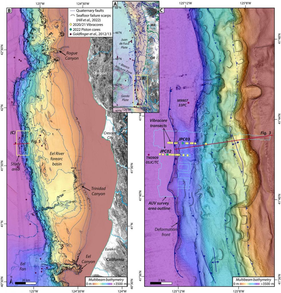 Геологи изучали континентальный склон у побережья Кресент-Сити, Калифорния, и выяснили, что мощные подводные оползни оставляют на дне океана характерные слои осадочных пород — турбидиты. Радиоуглеродное датирование показало, что часть этих «шрамов» формировалась в результате землетрясений за последние 7500 лет.