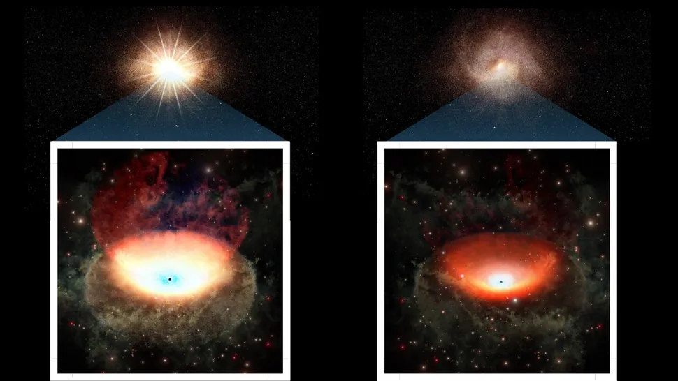 Слева: сверхмассивная черная дыра в фазе яркого излучения. Справа: та же самая черная дыра после того, как перестала поглощать материю и она потускнела. Фото предоставлено Технологическим институтом Тиба