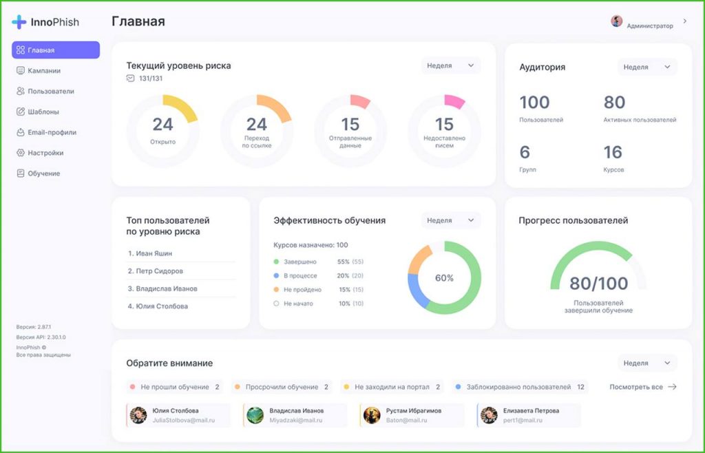 После рассылки администратор видит в реальном времени, кто из сотрудников попался на фишинг, а кто сообщил о подозрительном письме в отдел безопасности. «ИнноФиш» автоматически отправляет скомпрометировавшим данные коллегам приглашения на обучение с контрольным тестированием. В системе встроено 20 курсов: правила получения доступов, проверка обновлений, двухфакторная аутентификация, психологические приёмы мошенников и другие темы.