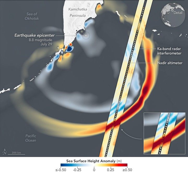 Спутник SWOT (совместный проект НАСА и французского CNES) случайно пролетел над эпицентром цунами впервые получил детальные космические снимки такого явления. Изображение показало не единый гребень, а сложную сеть, по которой энергия рассеивалась на сотни километров.